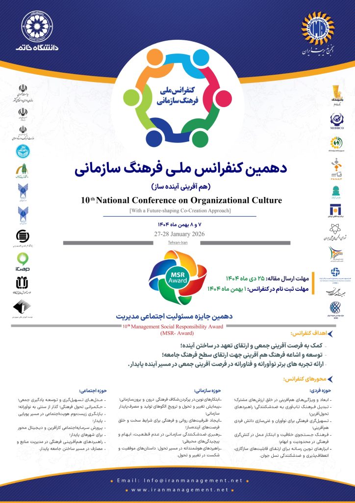 ” انجمن مدیریت ایران“ با همکاری“دانشگاه خاتم” و حمایت علمی وزارت خانه ها، دانشگاه ها، سازمان ها و نهادهای معتبر هر سال در بهمن ماه کنفرانس ملی فرهنگ سازمانی را برگزار می نماید.